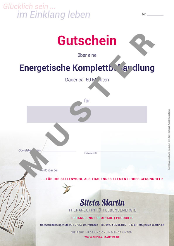 Gutschein über eine energetische Komplettbehandlung in meiner Praxis in 97656 Oberelsbach, Dauer ca. 60 Minuten. Nach vorheriger Terminvereinbarung.